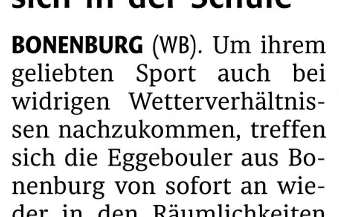 Die Eggebouler treffen sich in der Schule Um ihren geliebten Sport auch bei widrigen Wetterverhältnissen nachzukommen, treffen sich die Eggebouler aus Bonneburg von sofort an wieder in den Räumlichkeiten der alten Schule. Die Treffen sind [...]