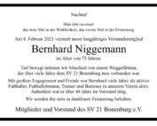 Mit großer Bestürzung mussten wir zur Kenntnis nehmen, dass Bernhard Niggemann, langjähriges und hochverdientes Mitglied unseres SV 21 Bonenburg, am vergangenen Montag im Alter von 73 Jahren verstorben ist. Der SVB hatte stets einen wichtigen [...]