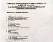 Einladung zur Jahreshauptversammlung des SV 21 Bonenburg e.V. am 29.08.2020 um 19.21 Uhr in der Gaststätte "Zur schönen Aussicht" unter Einhaltung der notwendigen Hygienevorschriften Tagesordnung zur Jahreshauptversammlung: Begrüßung durch den 1. Vorsitzenden Feststellung der frist- [...]